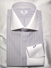 2025年08月27日受注 京都・京都市のA.K様 常連のお客様ですが国産綿ストライプで襟型はホリゾンタルワイドカラーになります。クレリックカラーで白が映えますね。!(^^)!